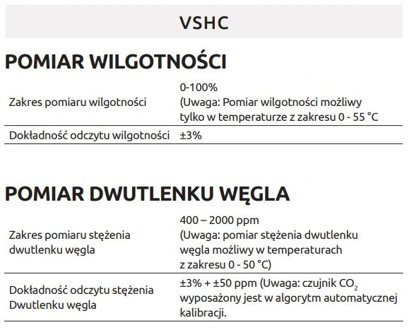 Dzięki zaawansowanym algorytmom kalibracji, VSHC gwarantuje dokładne pomiary. Aby zachować wysoką precyzję, zaleca się wietrzenie pomieszczenia przynajmniej raz w miesiącu. Urządzenie podaje pierwszą wartość po 3 minutach od włączenia, a pełna stabilizacja następuje po 30 minutach pracy.