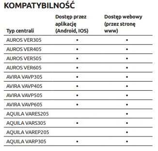 Moduł VLAN (iNEXT) jest kompatybilny ze wszystkimi centralami AWENTA PRO – Auros, Avira, Aquila Easy, Aquila. W przypadku central Auros, Avira i Aquila obsługa możliwa jest również przez dedykowaną aplikację mobilną na smartfony.