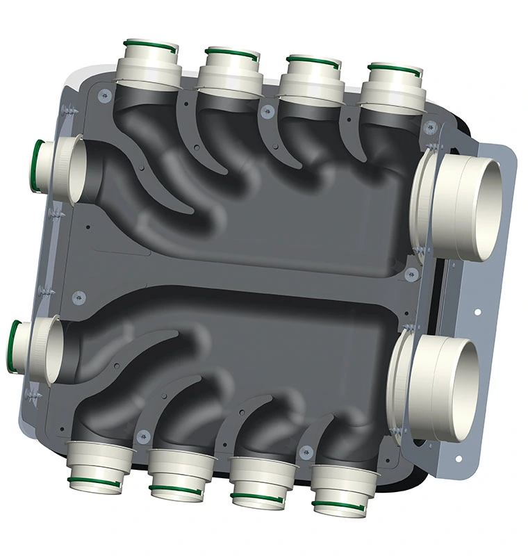 Rozdzielacz do centrali wentylacyjnej AQUILA to nowoczesne rozwiązanie umożliwiające efektywne zarządzanie dystrybucją powietrza w systemach rekuperacji. Przeznaczony do podłączenia do 10 kanałów Ø75 mm (5 nawiewnych + 5 wywiewnych), zapewnia optymalny przepływ powietrza i zwiększa efektywność działania centrali.