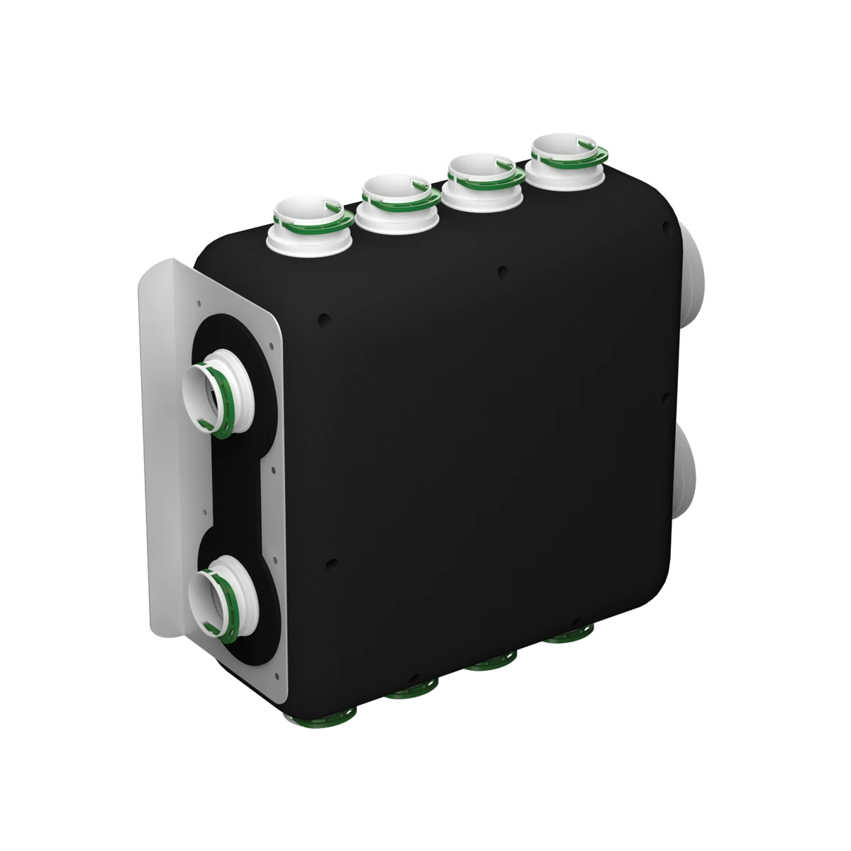 Rozdzielacz do centrali wentylacyjnej AQUILA to nowoczesne rozwiązanie umożliwiające efektywne zarządzanie dystrybucją powietrza w systemach rekuperacji. Przeznaczony do podłączenia do 10 kanałów Ø75 mm (5 nawiewnych + 5 wywiewnych), zapewnia optymalny przepływ powietrza i zwiększa efektywność działania centrali.
